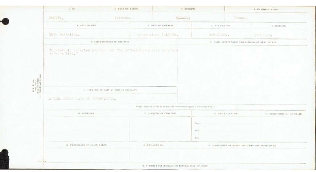 | Date of Death: | Killed in Action , 9th October , 1916 | ||||||